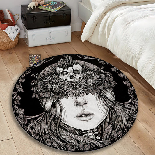 Black Girl With Skull Rug, Gothic Girl Carpet, Vintage Horror Round Mat, Scary Decor, Gothic Room Rug