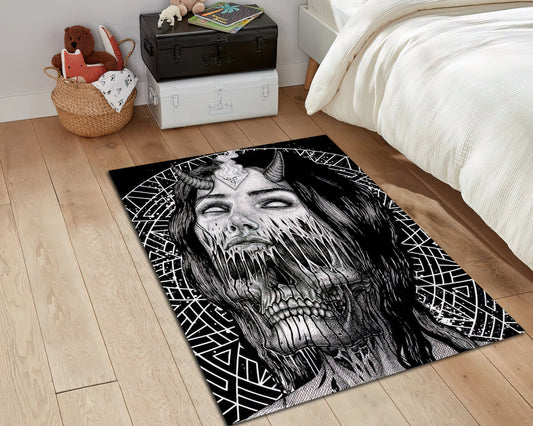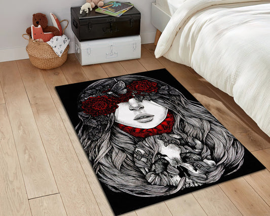 Gothic Girl Rug, Girl With Skull Carpet, Gothic Rose Mat, Black Vintage Horror Decor, Scary Gift