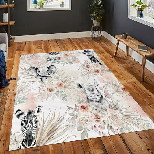 Baby Safari Animals Rug, Elephant Carpet, Giraffe Mat, Baby Room Rug, Nursery Floral Mat
