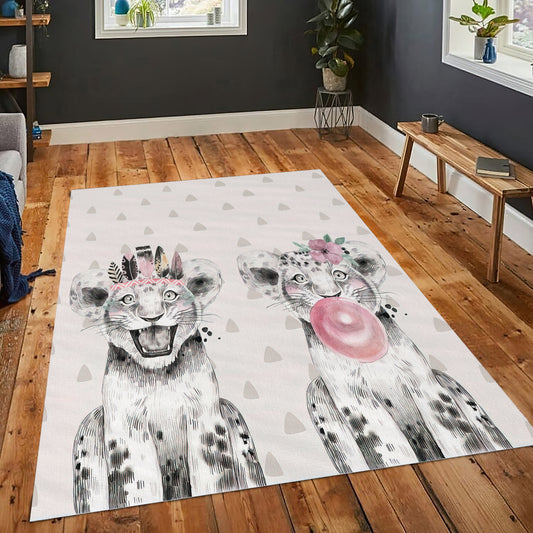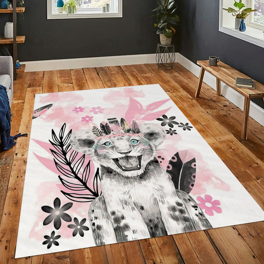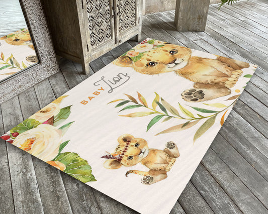 Baby Lion Themed Rug, Floral Carpet, Animal Decor, Kids Room Mat, Baby Gift