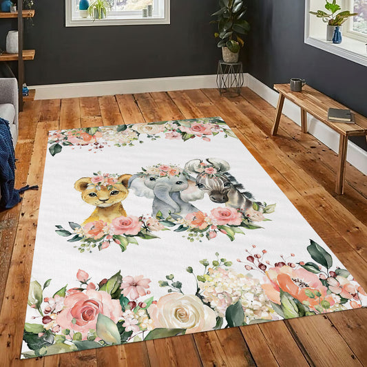 Floral Nursery Rug, Baby Animals Rug, Lion, Zebra, Elephant, Baby Room Carpet, Baby Gift