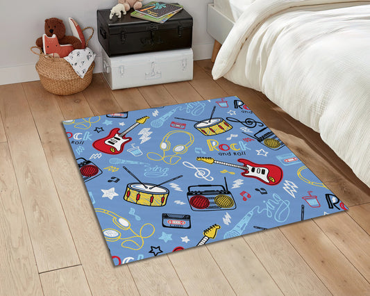 Musical Instruments Pattern Rug, Blue Kids Room Carpet, Baby Play Mat, Baby Gift