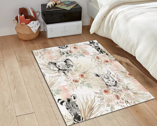 Cute Animals Nursery Rug, Baby Room Carpet, Floral Pattern Mat, Baby Shower Decor, Baby Gift