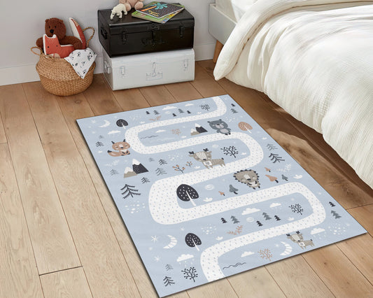 Blue Baby Room Rug, Animal Printed Carpet, Kids Room Mat, Nursery Decor, Baby Gift