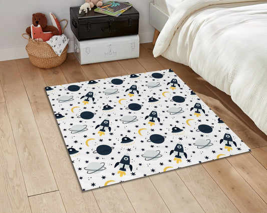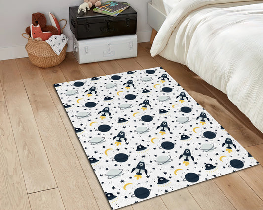 Rocket Pattern Rug, Kids Room Carpet, Galaxy Decor, Nursey Mat, Moon, Planets, Stars Themed Rug