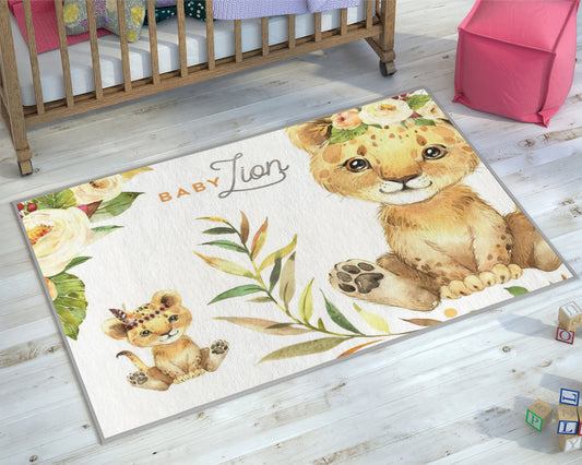 Baby Lion Rug, Cute Animal Carpet, Floral Mat, Baby Room Decor, Nursery Rug, Baby Gift