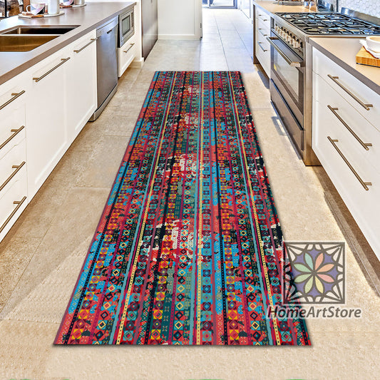 Ethnic Boho Runner Rug, Colorful Kitchen Runner Carpet, Geometric Hallway Runner Rug, Tribal Home Decor