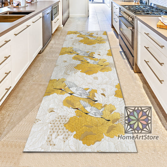 Gold Color Floral Rug, Retro Style Kitchen Runner Carpet, Abstract Mat, Crane Bird Rug