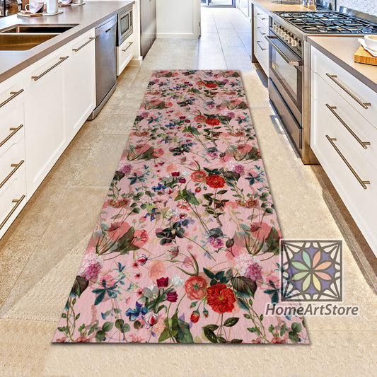 Pink Flower Pattern Runner Rug, Boho Style Kitchen Runner Mat, Hallway Runner Carpet, Floral Rug