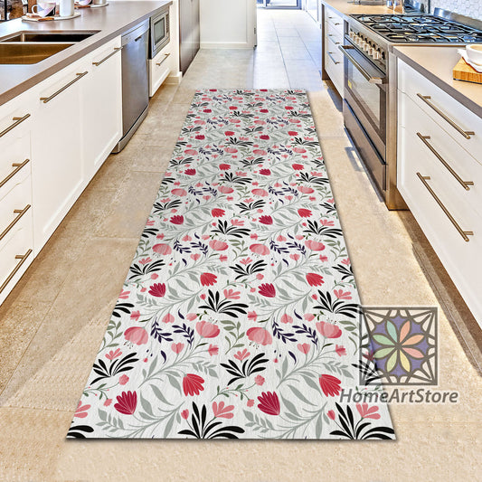 Flowers And Plants Themed Kitchen Runner Rug, Modern Hallway Carpet, Boho Rug, Floral Runner Mat, Boho Decor