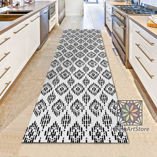 Black and White Boho Runner Rug, Ethnic Kitchen Runner Carpet, Diamond Pattern Hallway Runner Mat, Geometric Decor
