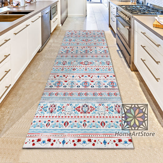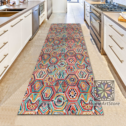 Colorful Tribal Runner Rug, Bohemian Carpet, Hallway Runner Mat, Boho Kitchen Runner Rug, Ethnic Pattern Rug