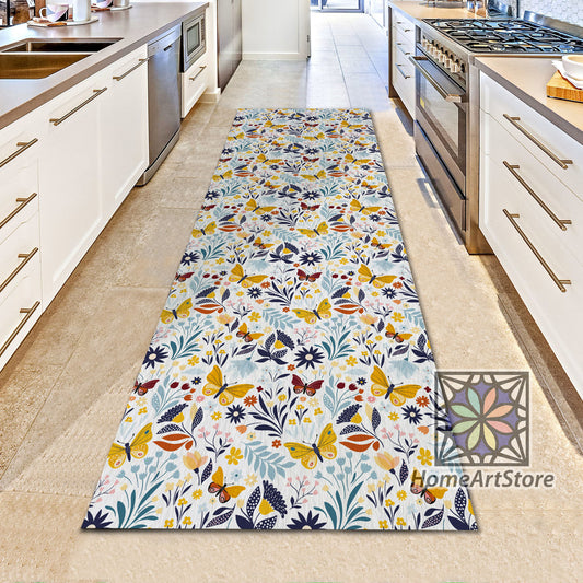 Butterfly and Flowers Pattern Rug, Botanical Decor, Boho Runner Rug, Kitchen Runner Carpet, Floral Rug, Bohemian Decor