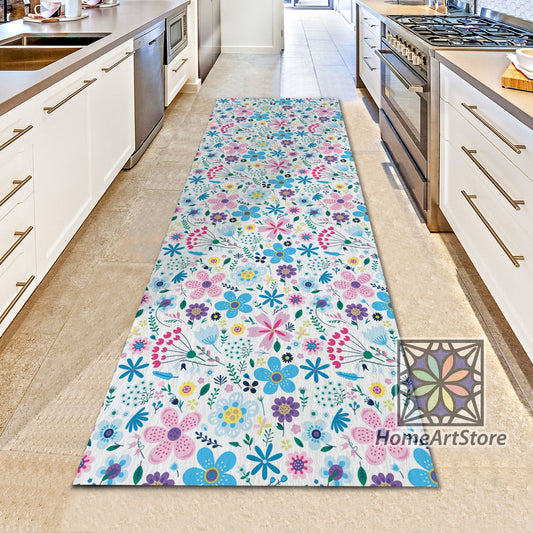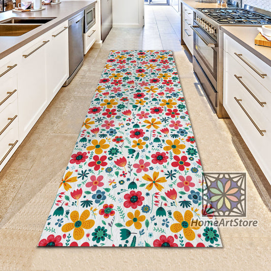 Colorful Floral Pattern Runner Rug, Modern Boho Decor, Flowers Pattern Kitchen Carpet, Bohemian Carpet