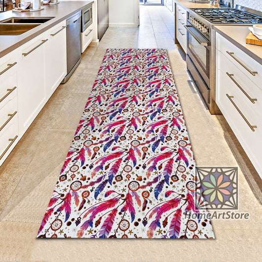 Dream Catcher Pattern Rug, Boho Style Kitchen Runner Rug, Colorful Ethnic Feather Hallway Runner Mat