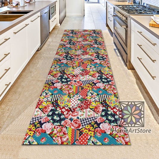 Patchwork Pattern Runner Rug, Rose Themed Carpet, Flower Runner Mat, Colorful Kitchen Runner Rug