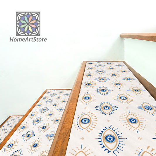 Evil Eye Pattern Stair Rug, Boho Stair Treads Carpet, Witchcraft Stair Step, Machine Washable, Non-Slip Backing, Stylish Stair Tread