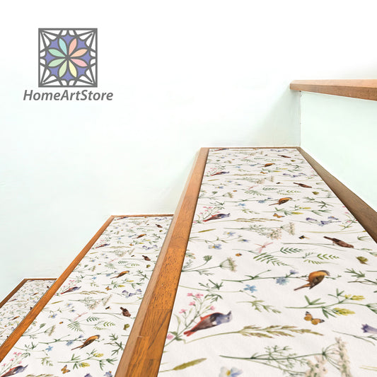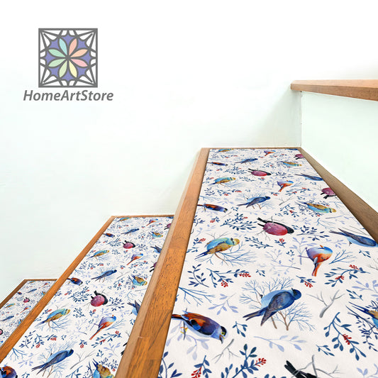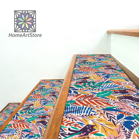 Birds Pattern Stair Rugs, Leaves Pattern Stair Tread Carpet, Colorful Nature Step Mats, Boho Step Carpet, Housewarming Gift