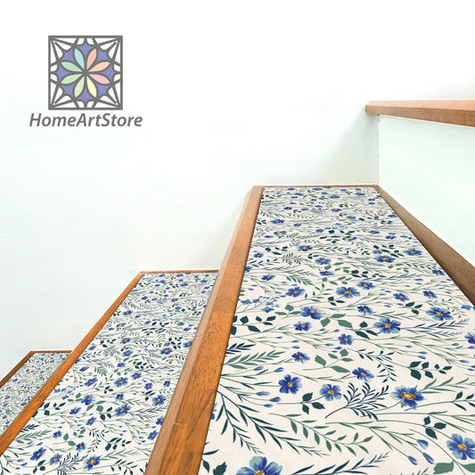 Blue Meadow Pattern Stair Rugs, Floral Stair Tread Mats, Flower Step Carpet, Nonslip Modern Step Rugs