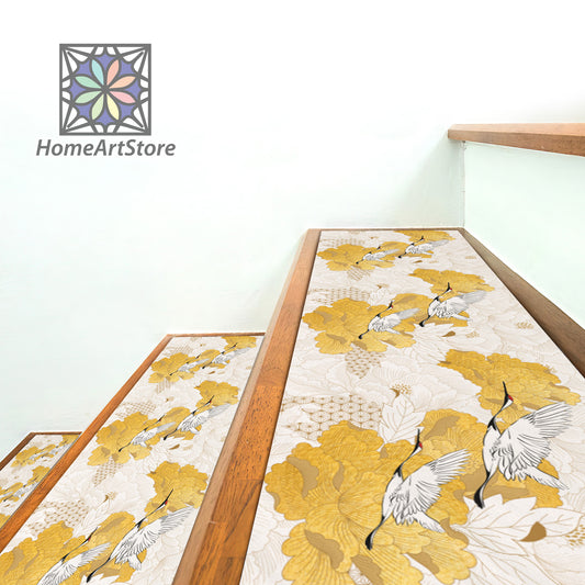 Crane Bird Pattern Stair Rugs, Gold Color Floral Stair Step Mats, Modern Stair Tread Carpet, Boho Style Stylish Step Mat