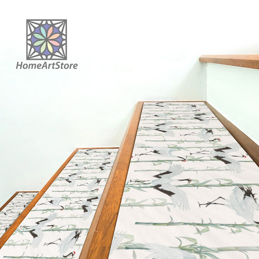 Crane Birds Stair Rugs, Bamboo Pattern Stair Tread Carpet, Non-Slip Stair Step Mats, Asian Home Decor, Boho Step Rug