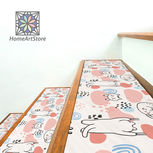 Cute Cats Printed Stair Tread Rugs, Cartoon Stair Carpet, Animal Step Mats, Minimal Step Rugs