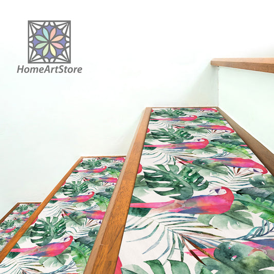 Exotic Floral Pattern Stair Rugs, Parrot Themed Step Mats, Tropical Leaves Decor, Boho Stair Carpet, Hawaiian Stair Rugs