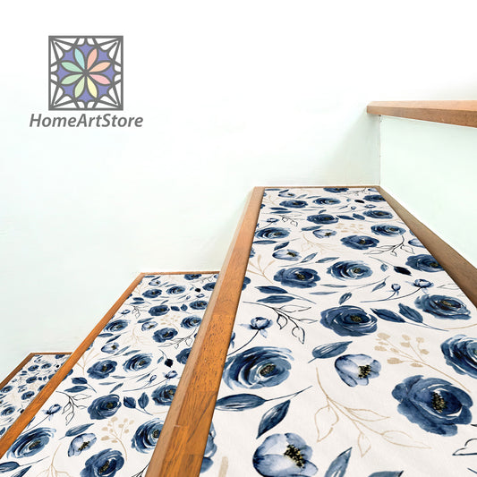 Navy Blue Roses Pattern Stair Rugs, Floral Stair Tread Mats, Decorative Stair Carpet, Modern Step Mat