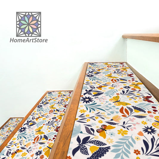 Butterfly Pattern Stair Step Rugs, Flowers Themed Stair Mats, Boho Style Decor, Floral Stair Tread Carpet