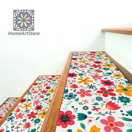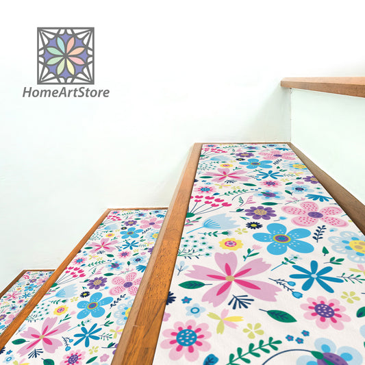 Colorful Floral Pattern Stair Rugs, Flowers Stair Step Mats, Boho Style Decor, Nonslip Backing Rug, Modern Stair Mats