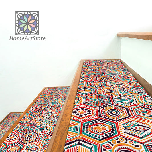Hexagon Shapes Printed Stair Rugs, Ethnic Stair Step Mats, Authentic Step Carpet, Authentic Stair Mats
