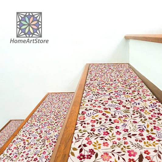 Floral Pattern Stair Step Rugs, Red Meadow Flower Step Mats, Bohemian Stair Carpet, Colorful Step Mat