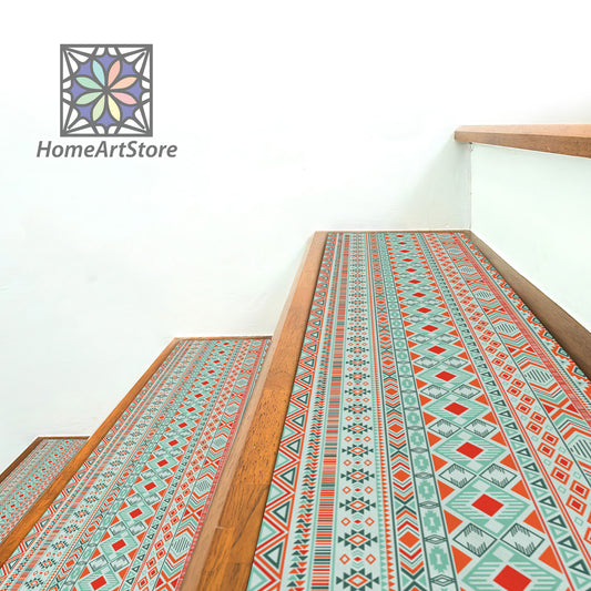 Tribal Motif Pattern Stair Rugs, Geometric Stair Mats, Bohemian Decor, Modern Stair Tread Carpet, Boho Style Step Mat, Ethnic Decor
