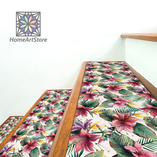 Tropical Flower Pattern Stair Step Rugs, Colorful Bohemian Step Mats, Nonslip Washable Stair Tread Carpet, Floral Step Mats