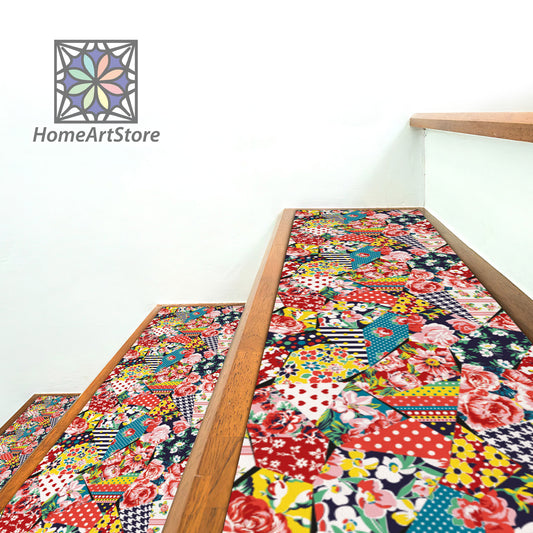 Colorful Patchwork Stair Rugs, Rose Flower Stair Step Mats, Floral Stair Mats, Boho Stair Carpet