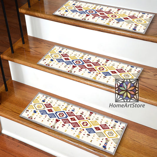 Patchwork Themed Stair Rugs, Boho Style Step Mats, Ethnic Stair Carpet, Colorful Geometric Pattern Stair Tread Rugs