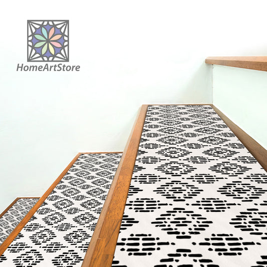 Black and White Geometric Stair Rug, Ethnic Stair Tread Carpet, Authentic Stair Mats, Modern Boho Stair Rugs