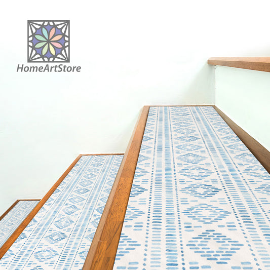 Bohemian Style Stair Mats, Blue and White Color Boho Stair Step Rugs, Scandinavian Stair Treads Carpet, Tribal Motif Home Decor
