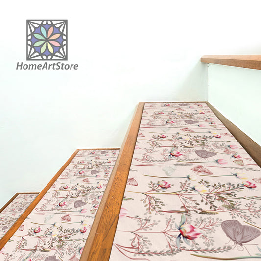 Flower and Butterfly Pattern Stair Rug, Authentic Stair Mats, Plants Pattern Stair Step Mat, Machine Washable Stair Mat