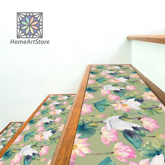 Lotus Flower Stair Step Rugs, Floral Stair Tread Carpet, Green Stair Mat, Boho Style Stair Carpet, Hawaii Decor