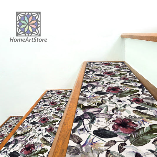 Magnolia Flower Pattern Stair Rugs, Boho Style Decor, Floral Stair Tread Mats, Floral Step Carpet, Tropical Stair Rugs
