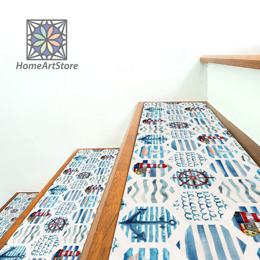 Stylish Stair Rug, Coastal Seaside House, Marine Decor, Blue Color Stair Tread Mat, Boho Style Step Mat