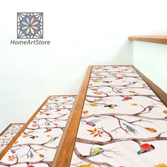 Birds Patterned Stair Rugs, Modern Stair Treads Carpet, Non-Slip Backing Mats, Machine Washable Rug