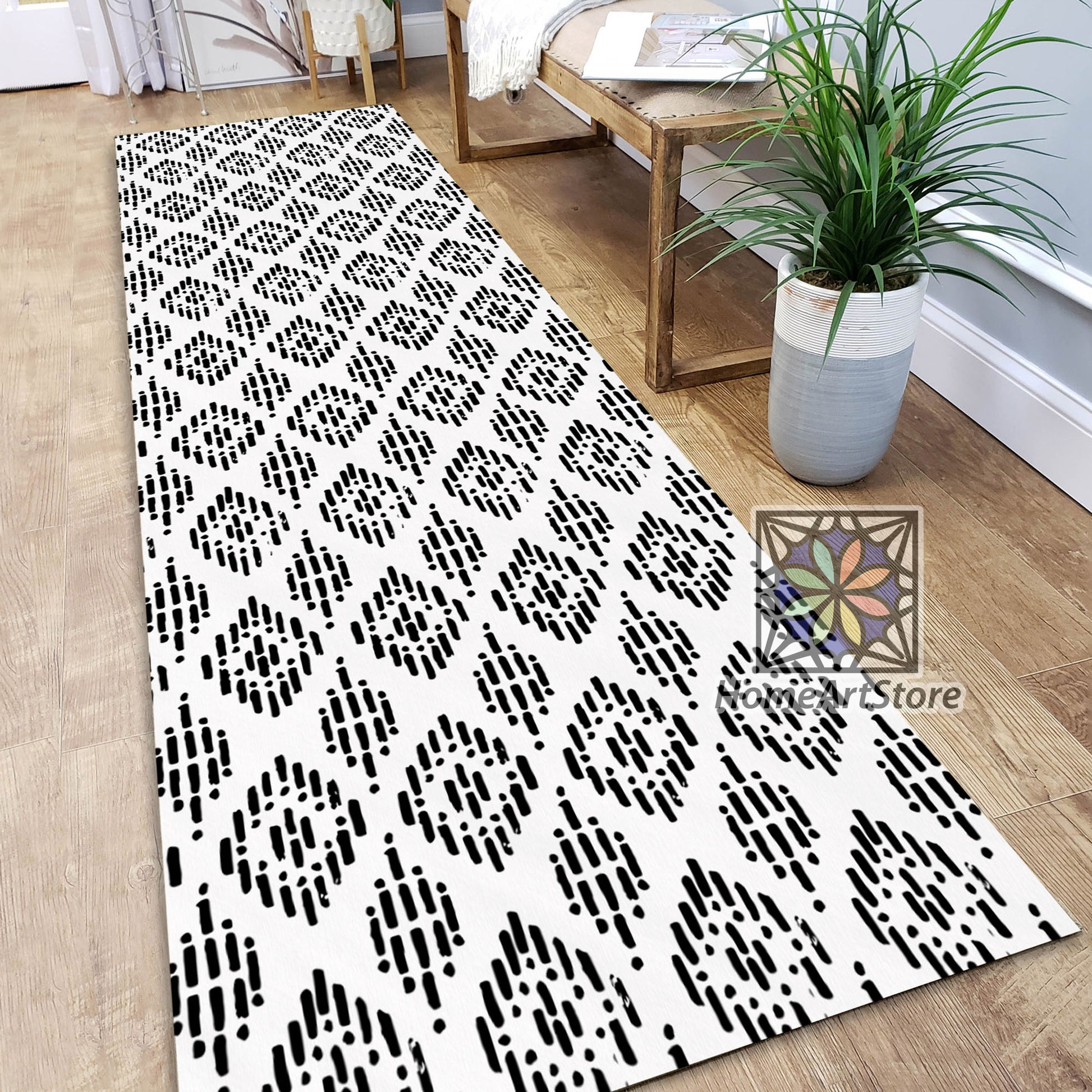 Black and White Boho Runner Rug, Ethnic Kitchen Runner Carpet, Diamond Pattern Hallway Runner Mat, Geometric Decor