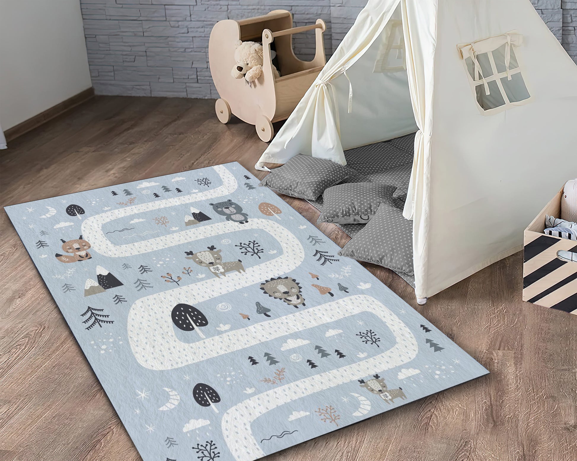Blue Baby Room Rug, Animal Printed Carpet, Kids Room Mat, Nursery Decor, Baby Gift