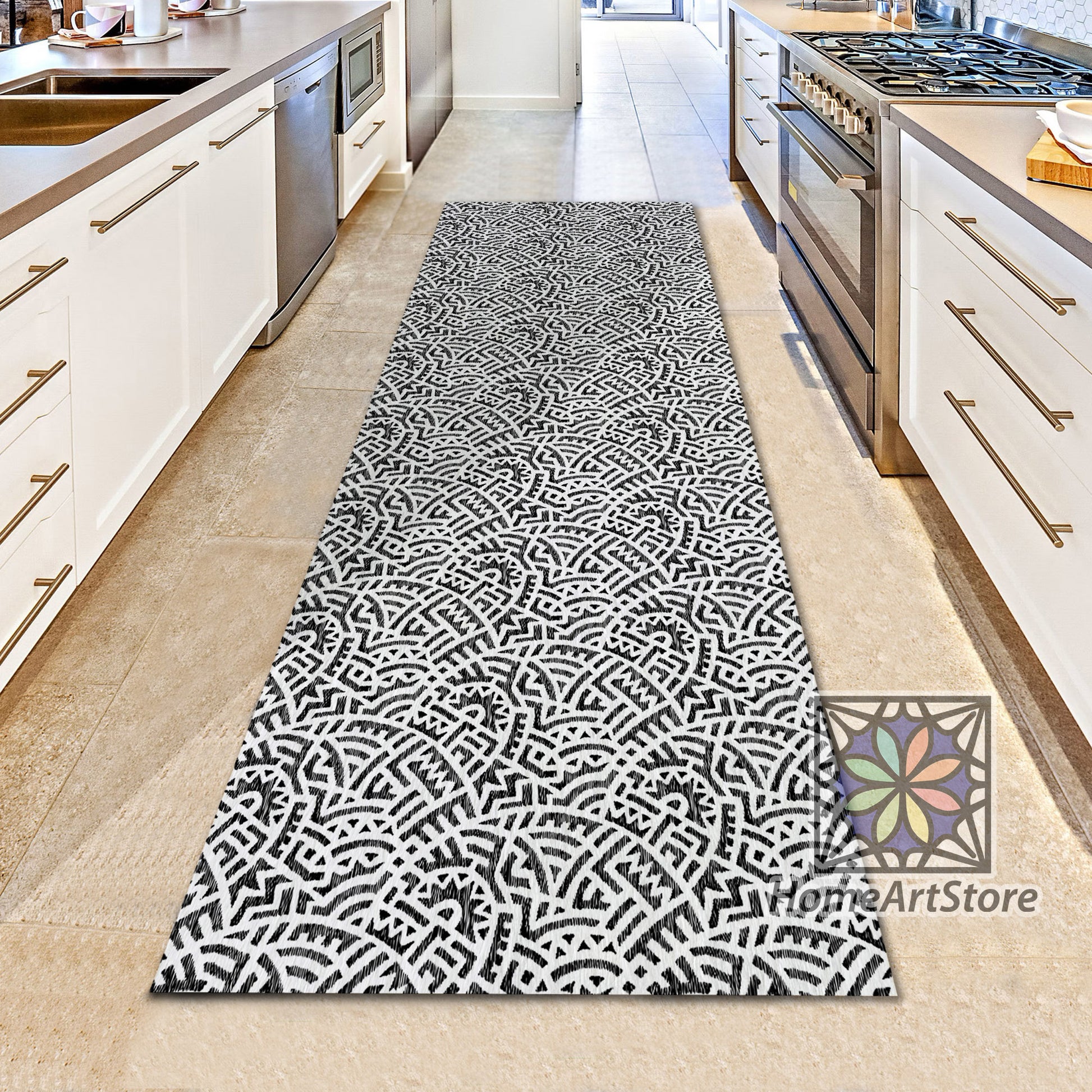 Boho Style Runner Rug, Black and White Bohemian Rug, Geometric Pattern Runner Rug, Kitchen Runner Mat, Line Art Carpet