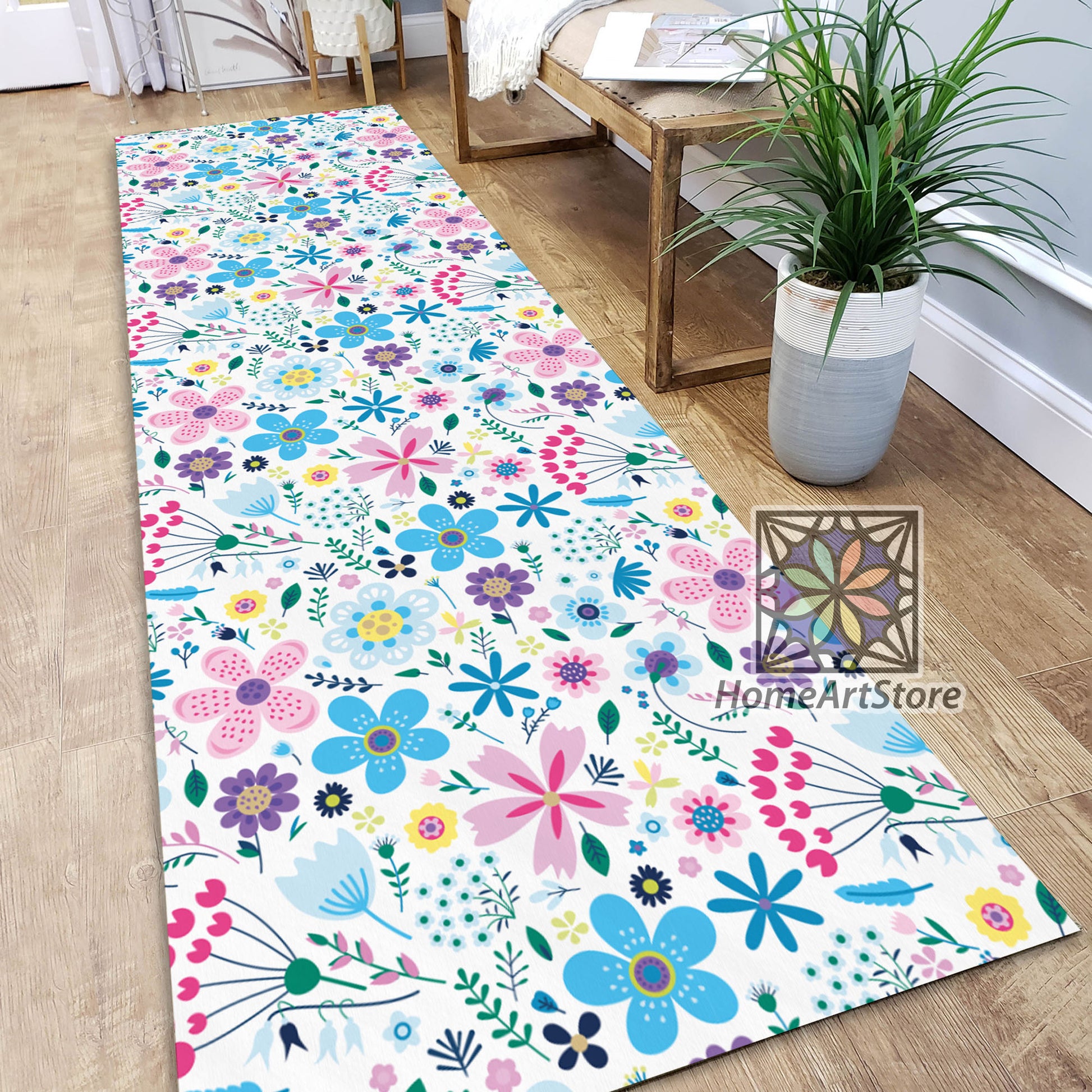 Boho Style Runner Rug, Colorful Floral Pattern Hallway Runner Mat, Flower Runner Carpet, Bohemian Decor