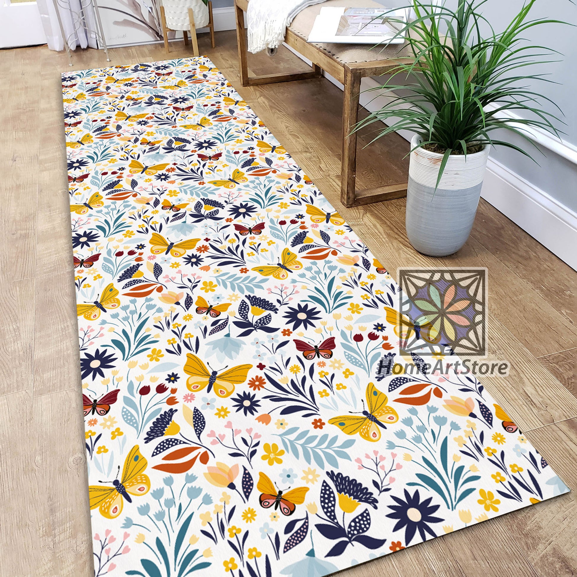 Butterfly and Flowers Pattern Rug, Botanical Decor, Boho Runner Rug, Kitchen Runner Carpet, Floral Rug, Bohemian Decor