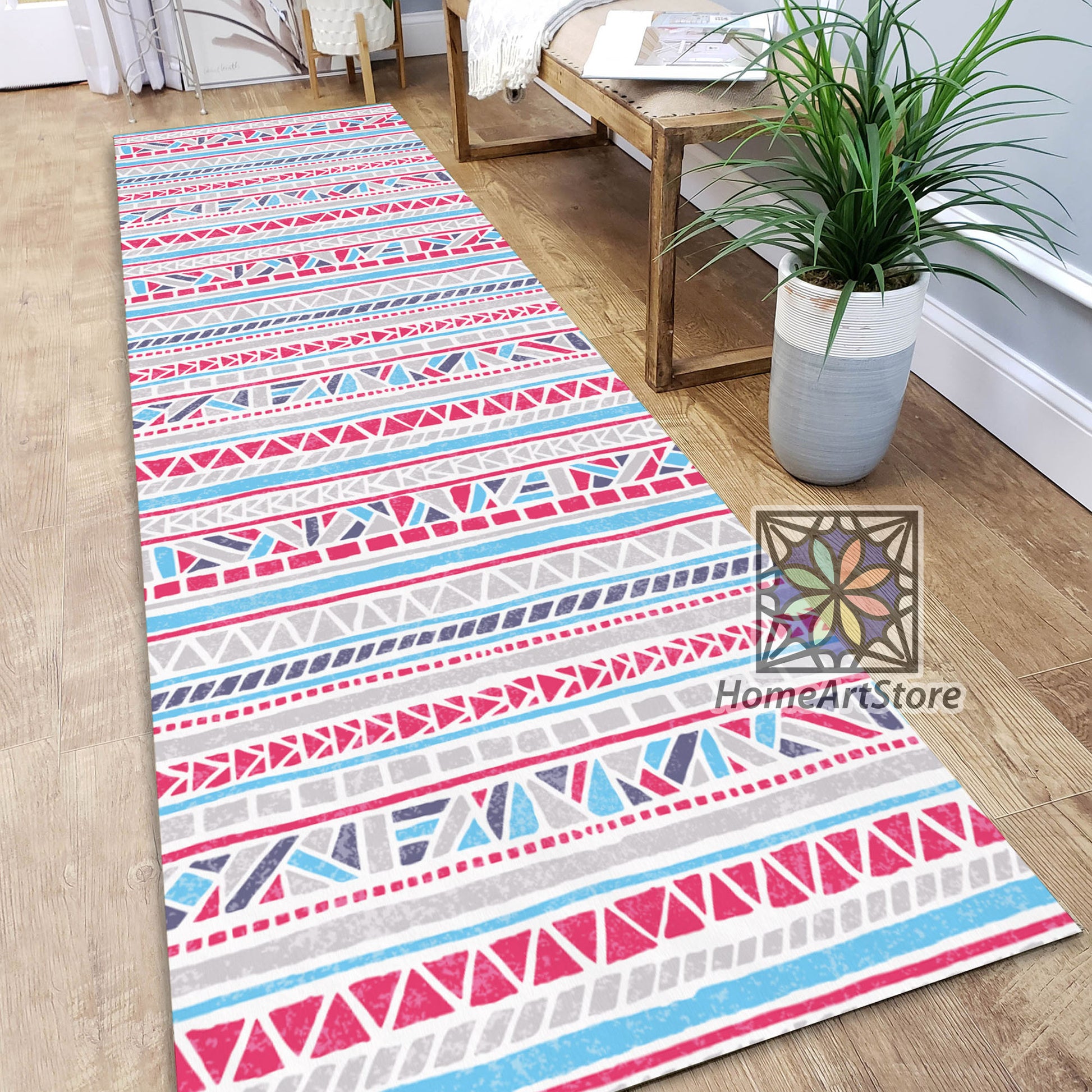 Colorful Geometric Rug, Ethnic Runner Rug, Boho Style Decor, Striped Kitchen Runner Carpet, Tribal Motif Mat
