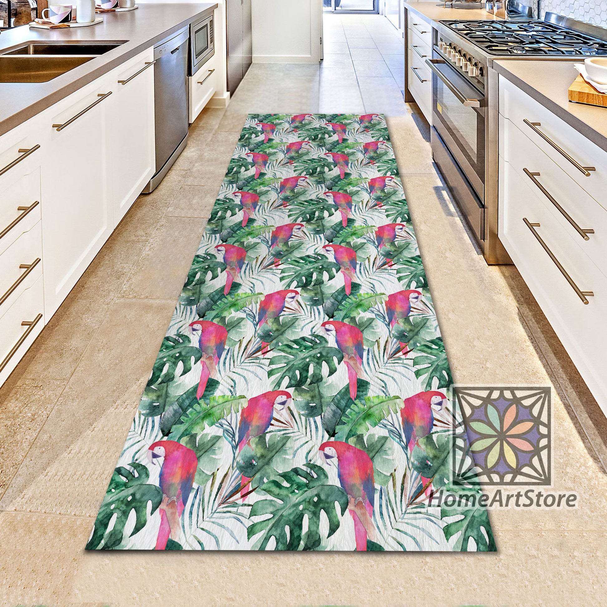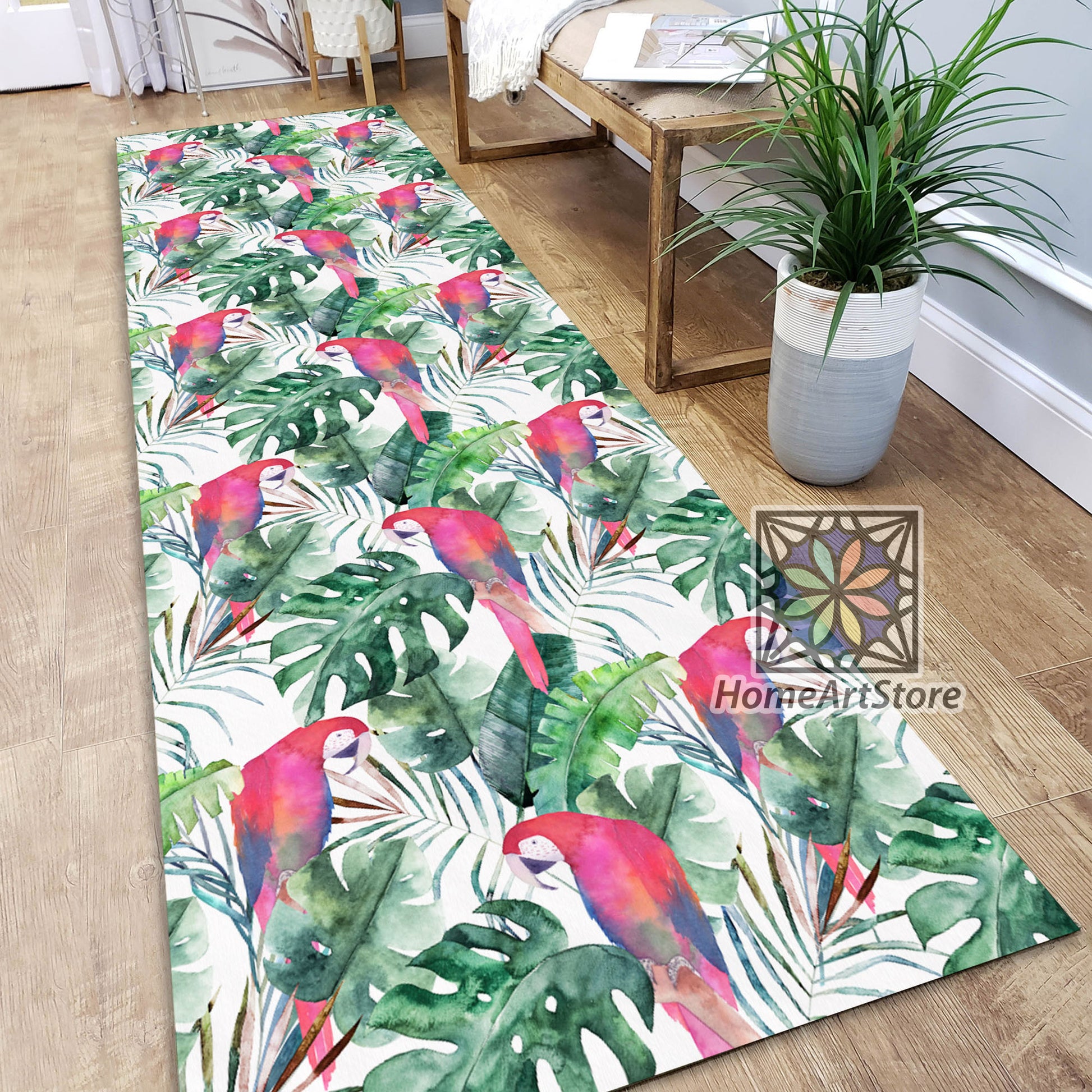 Exotic Floral Runner Rug, Parrot Themed Carpet, Tropical Pattern Runner Mat, Bohemian Decor, Cool Hallway Runner Rug